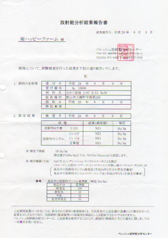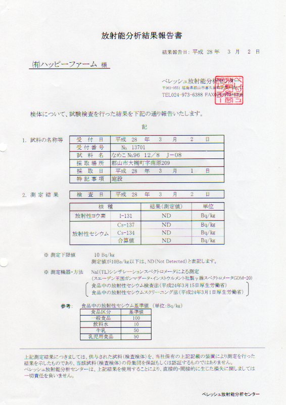 ハッピーファームでは放射能測定を定期的に実施し、安全の確認されたものをお届けしております。